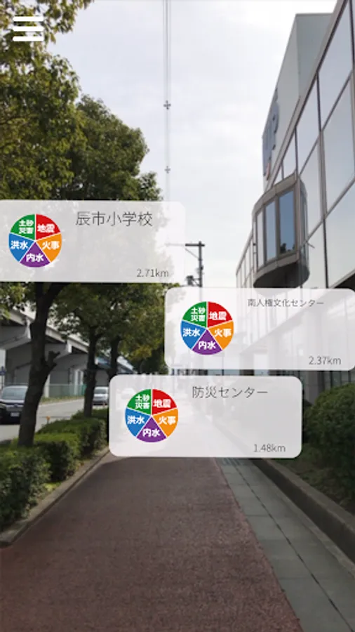 2, When the camera starts, when you place the smartphone over a place you like, the designated emergency evacuation place in Nara prefecture near the current location is displayed.