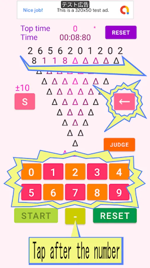 When you tap the start button, 10 numbers will be lined up on the first line. add two numbers in succession and enter them below.