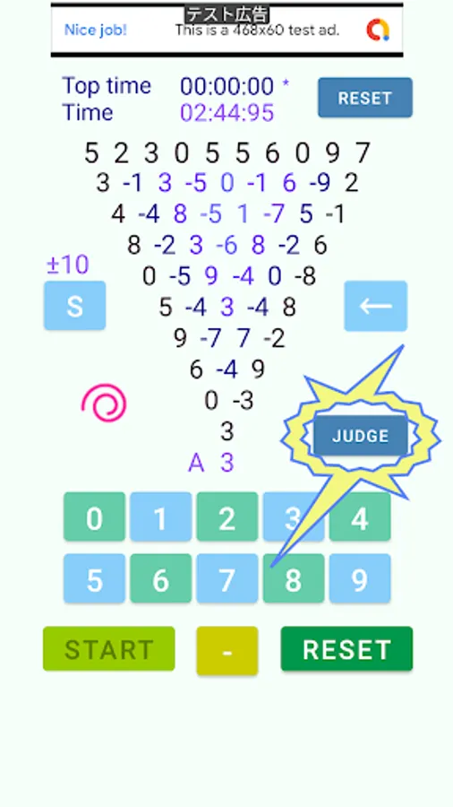 After inputting to the end, tap the JUDGE button. The clock will stop and the number of answers will appear next to A. If you do not press the JUDGE button, no answer will be given and the clock will not stop.If you make a mistake, the dog will judge.