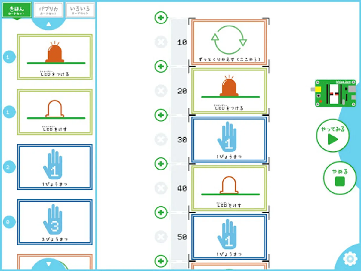 CutleryApps is a visual programming software for IchigoJam or IchigoLatte using a CutleryCard provided by Nittetsu Hitachi Systems Engineering, Inc. Everyone can easily learn programming by arranging cards side by side.
