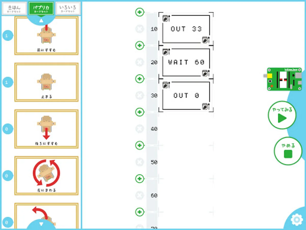 Turn over the arranged cards, type in the written letters to IchigoJam / IchigoLatte with the keyboard and run.