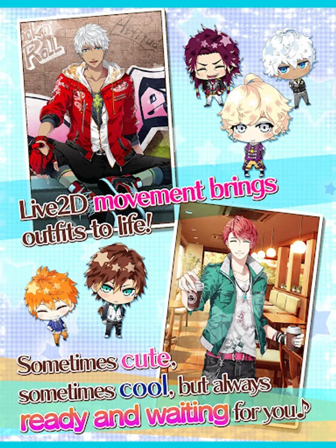 Plus, moving outfits give a whole new dimension of interactivity! With Live2D's Motion Technology, watch him move and react to your conversations, touches and even... kisses...?!