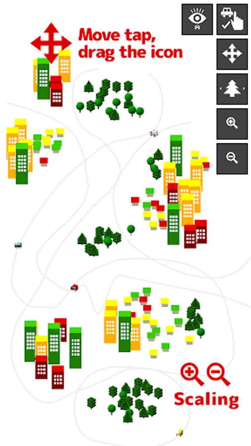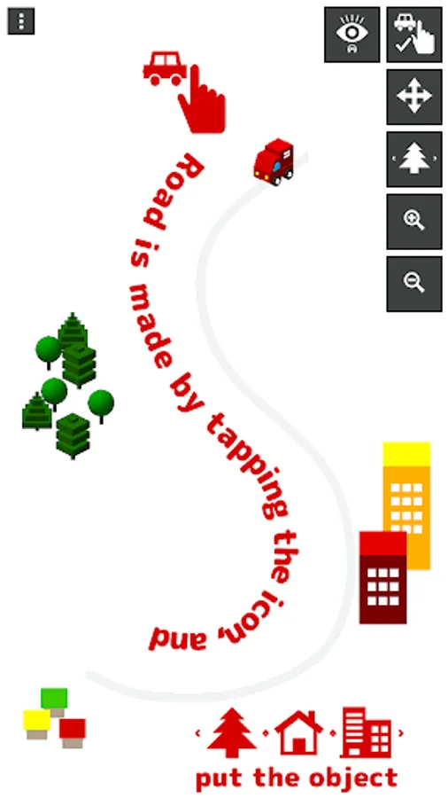 Touch and place a tree, house, building and drag and draw a road for cars to run.