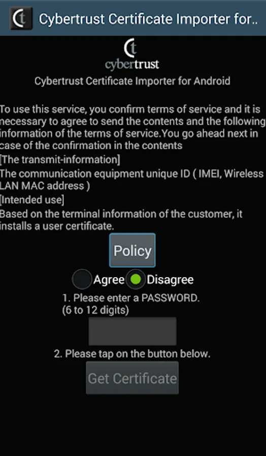This is a client certificate registration application working with the certificate issuance management service that Cybertrust Japan Co., Ltd. offers. This application achieves you the secure network access environment by registering the client certificate surely only in the Android-based devices that enterprises and organizations authorize.