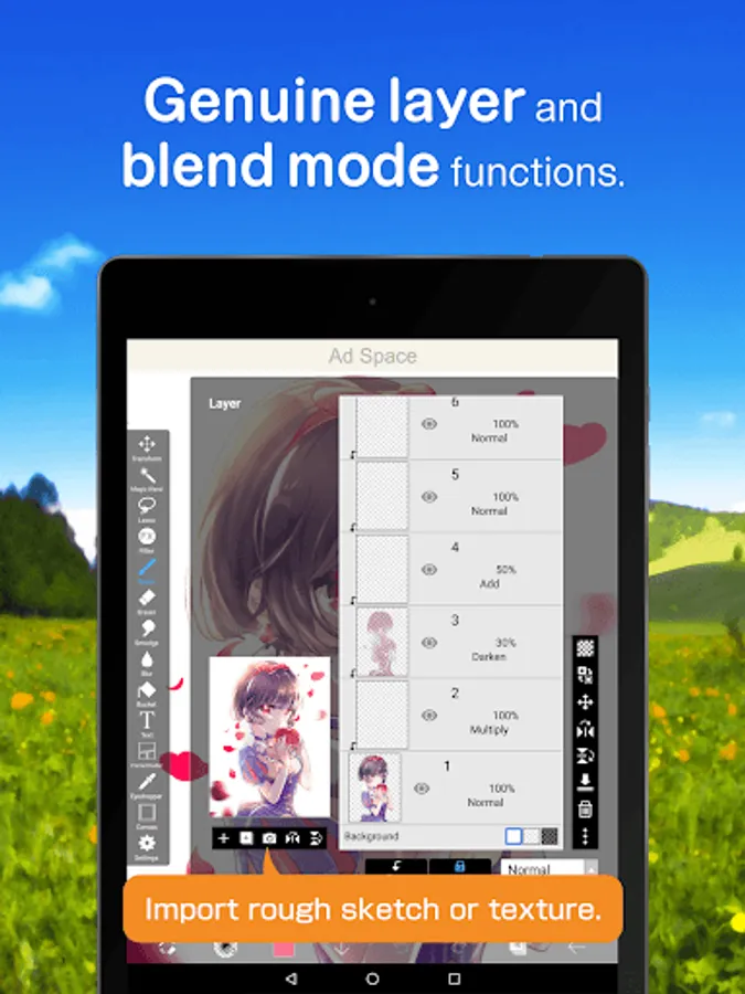 ibis Paint X is a popular and versatile drawing app downloaded more than 280 million times in total as a series, which provides over 15000 brushes, over 15000 materials, over 1000 fonts, 80 filters, 46 screentones, 27 blending modes, recording drawing processes, stroke stabilization feature, various ruler features such as radial line rulers or symmetry rulers, and clipping mask features.