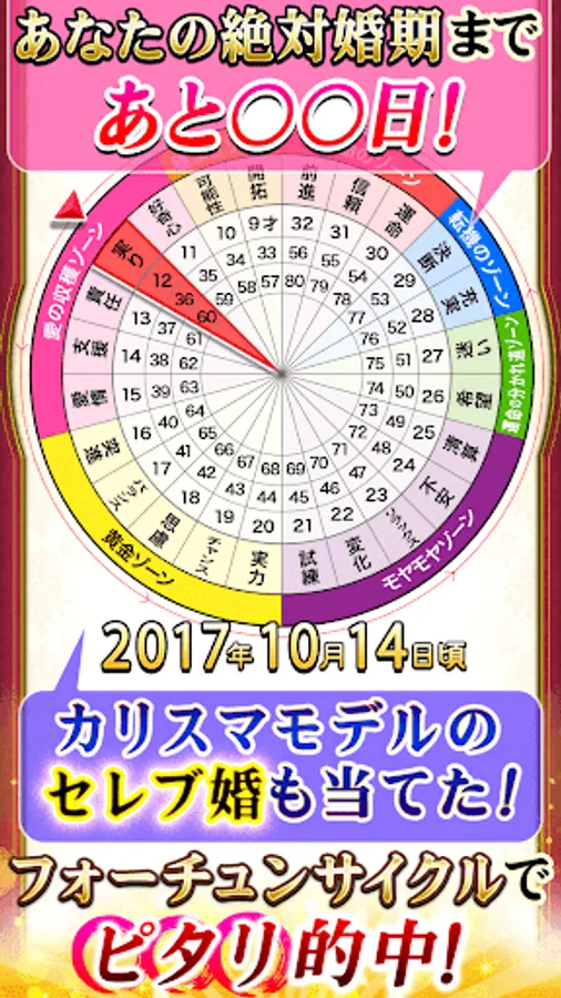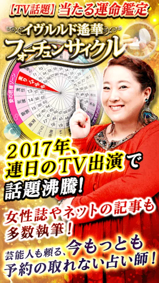 イヴルルド遙華の占いで特徴なのは「フォーチュンサイクル」。24年のサイクルにわかれ、一年一年にそれぞれのテーマがあります。過去に起こった出来事と、その年のテーマを照らし合わせれば、この占いの的中力の高さにきっとあなたも驚くはず。