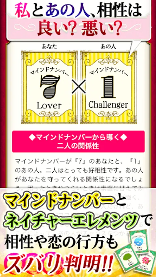 マインドナンバーでは、ナンバー同士の組み合わせで気になるあの人との相性がまるわかり! さらにネイチャーエレメンツで自分と相手の生き方や恋愛傾向が面白いほど当たります。