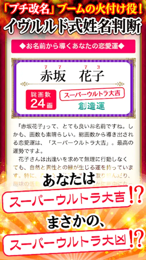 「プチ改名」ブームの発端にもなった、イヴルルド式姓名判断は、現代を生きるあなたのための新しい姓名判断。あなたの名前はスーパーウルトラ大吉でしょうか? まさかのスーパーウルトラ大凶?