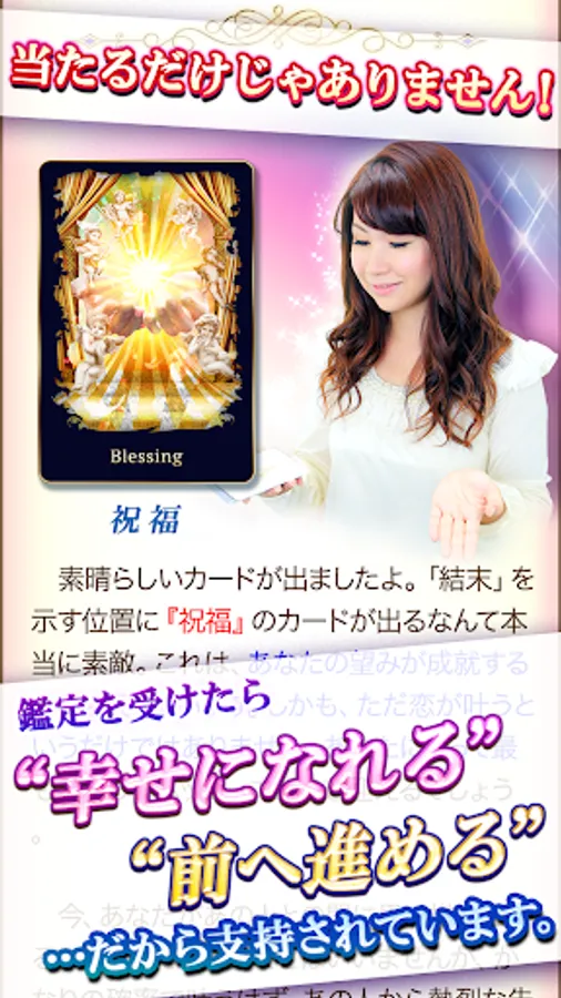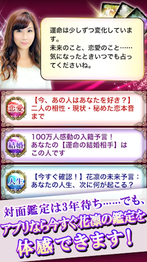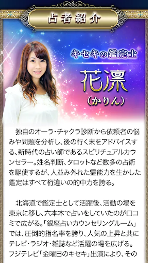 本アプリでは、占い界トップクラスの人気と実力を持つ“キセキの鑑定士・花凛”による、タロット鑑定をうけることができます。