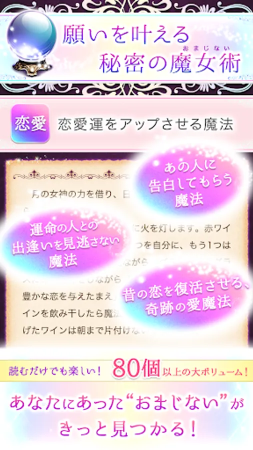 本アプリでは、3世紀続く、英国魔術の正当なる継承者・現代の魔女ミセス・カーシャの占いやおまじないを楽しむことができます。