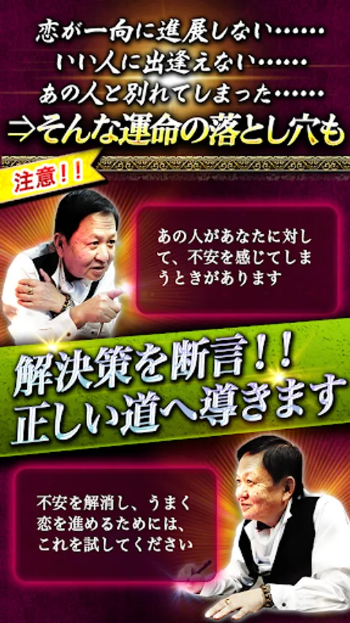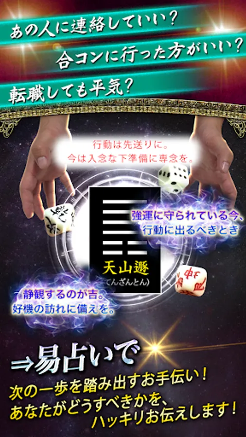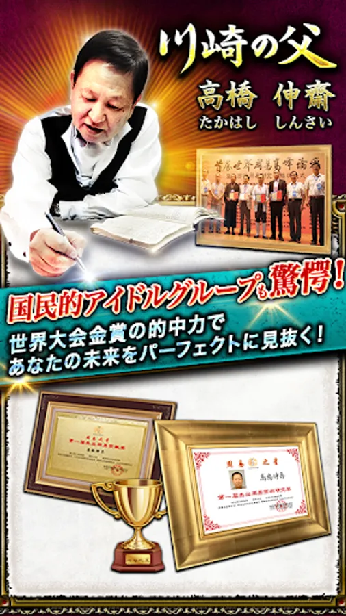 本アプリでは、中国政府認証の占い世界大会へ出場し、日本人で唯一の金賞を受賞した高橋伸斎の占いを体感することができます。