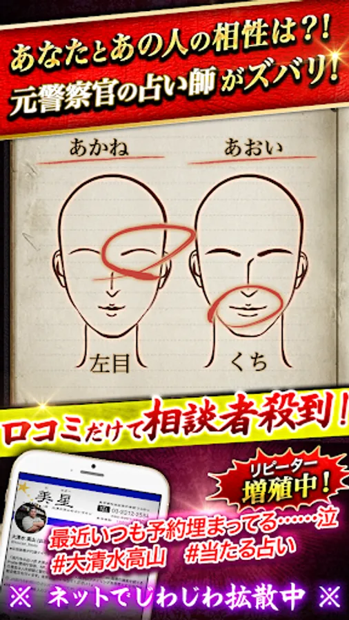 ※本アプリのダウンロードは無料です。有料鑑定メニューはアプリ内課金にてご用意しております。(有料鑑定メニューは購入する度に課金が発生します)