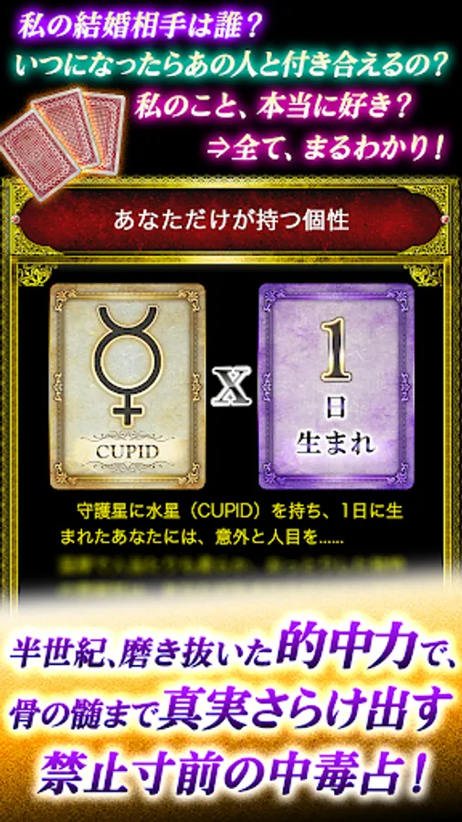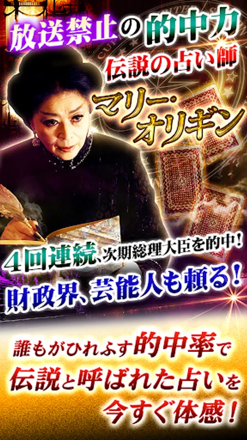 本アプリでは、70年代一世を風靡した伝説の占い師「マリー・オリギン」の鑑定を受けることができます。