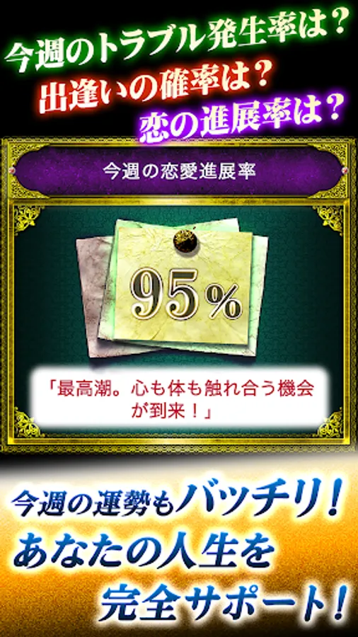 また「トラブル発生率」「二人の接近度」「出逢い確率」なども、数字でピタリと表示。未来を先取りして行動することで、望む未来、望む自分により近づくことができます。