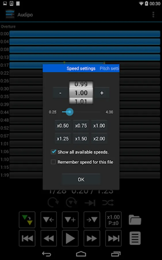 This app is an audio player that can change the speed and the pitch of audio contents.