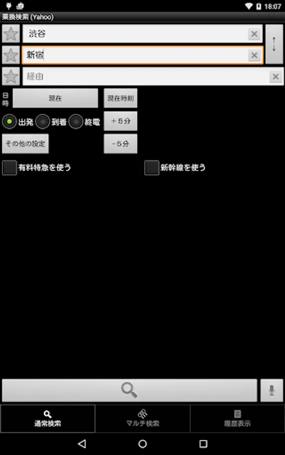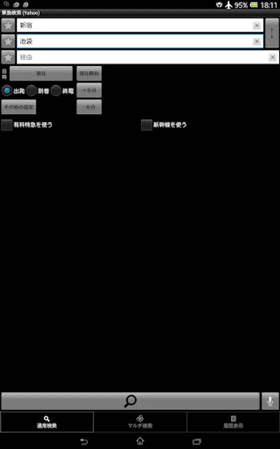 マイクボタンを押してから「新宿から横浜 終電」のように喋ると、言葉で指定した条件を入力してくれます。