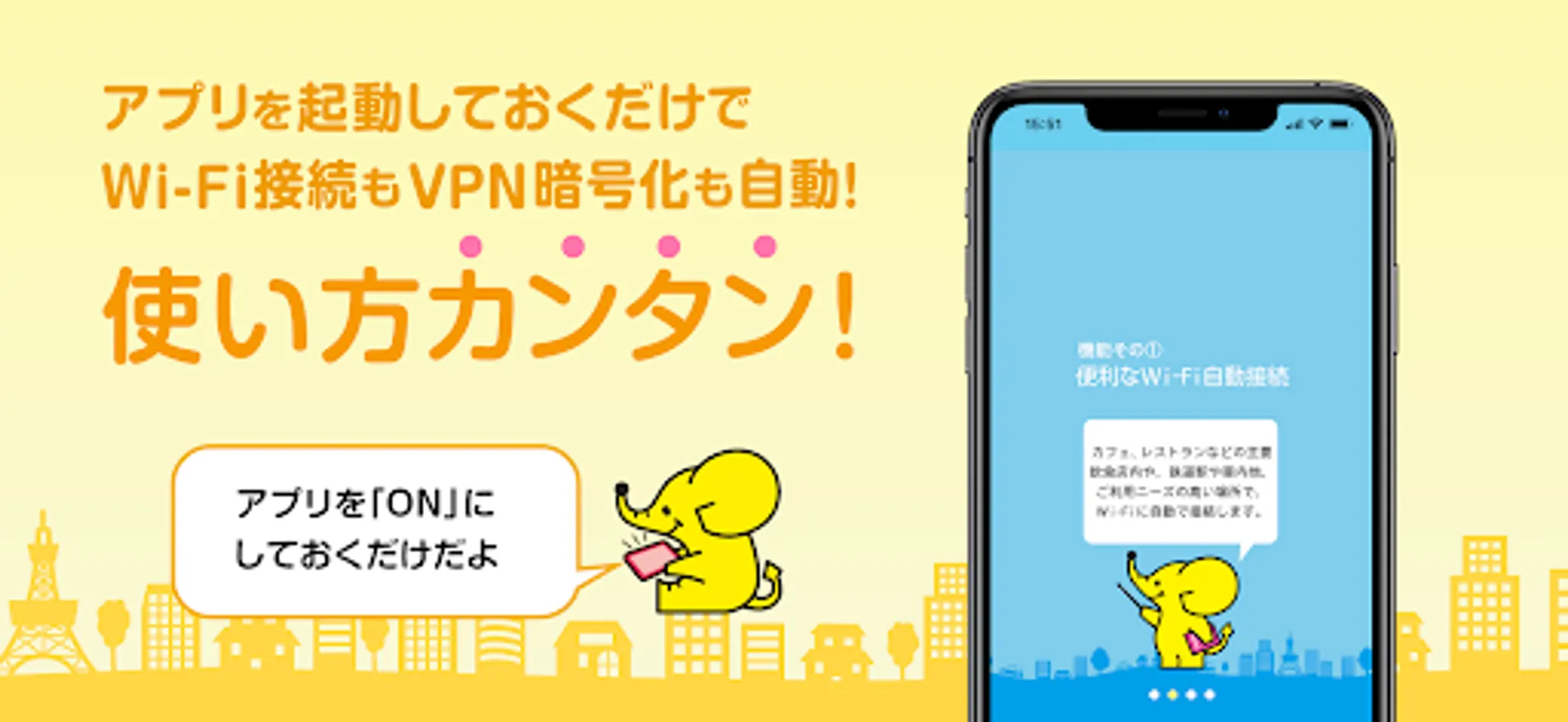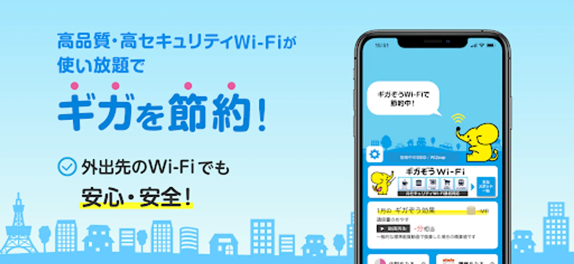 "Giga Elephant" has approximately 100,000 members' Wi-Fi spots, mainly high-quality (EAP-TTLS) compatible spots in the city operated by Wi2, and free Wi-Fi is also safe with the VPN function provided by Wi2. It is a membership-based service that allows unlimited use of high-security Wi-Fi services unique to telecommunications carriers at a flat rate without worrying about time or capacity.