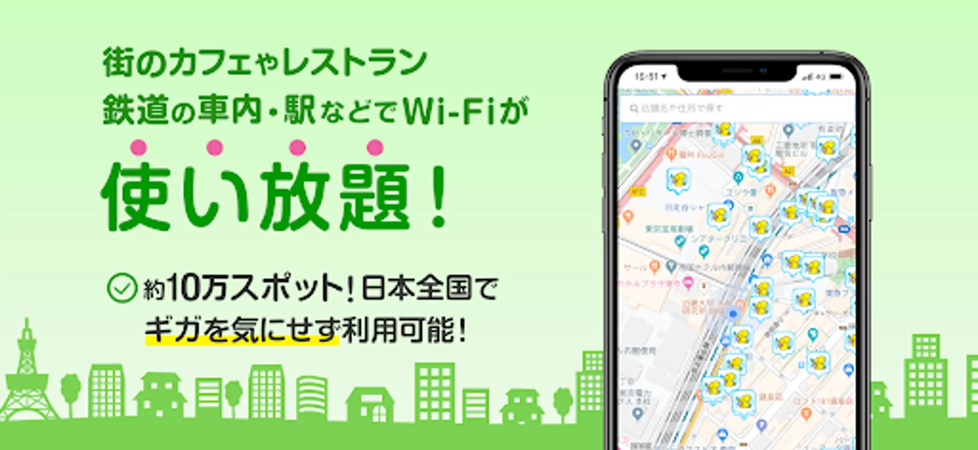 You can automatically connect to a high-security Wi-Fi equivalent to that of communication carrier Wi-Fi at cafés, family restaurants, and other major restaurant chains that have high demand for Wi-Fi, as well as at railway stations and trains nationwide.