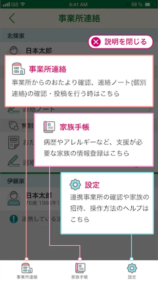 支援が必要な家族の情報を事業所や家族間で共有できます。