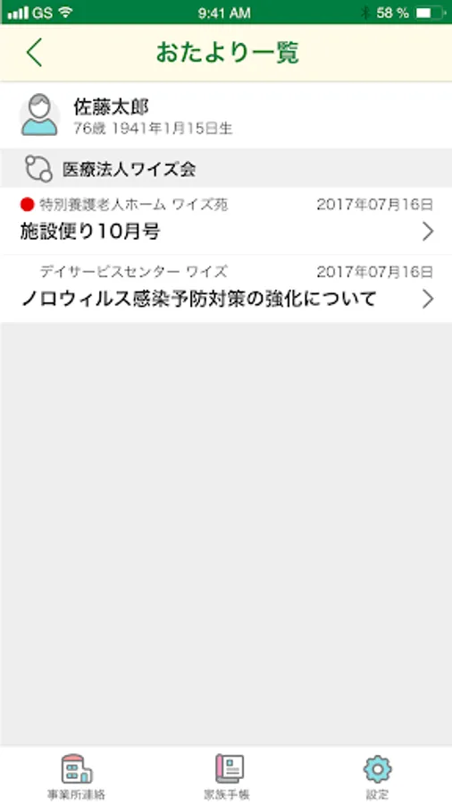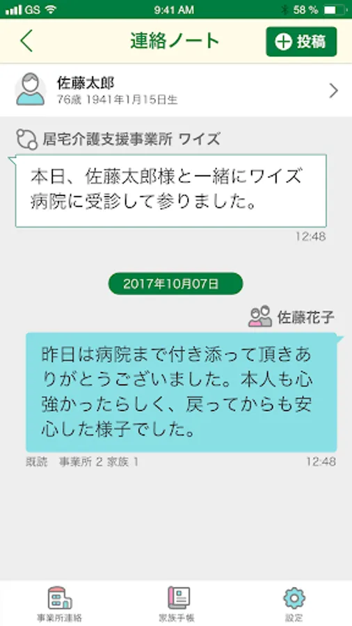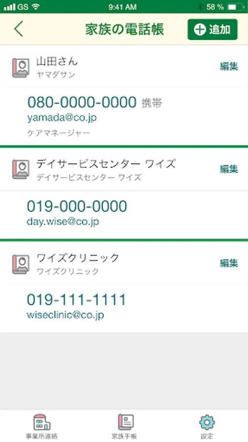 事業所、ケアマネジャーの連絡先をご家族で共有できます。