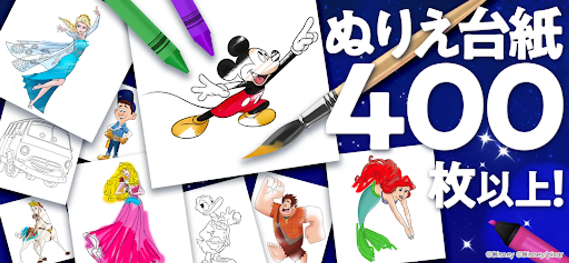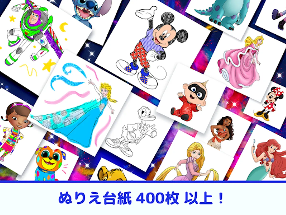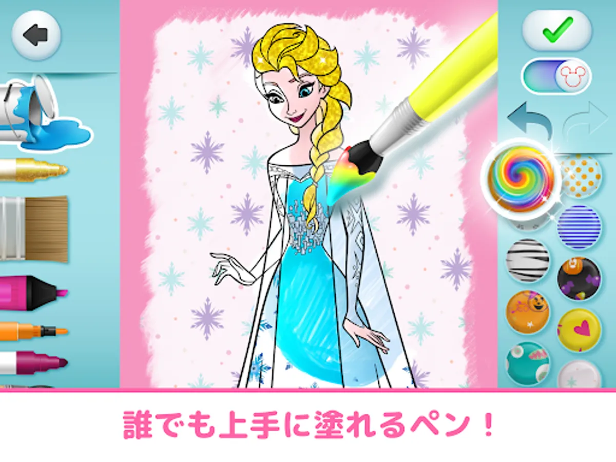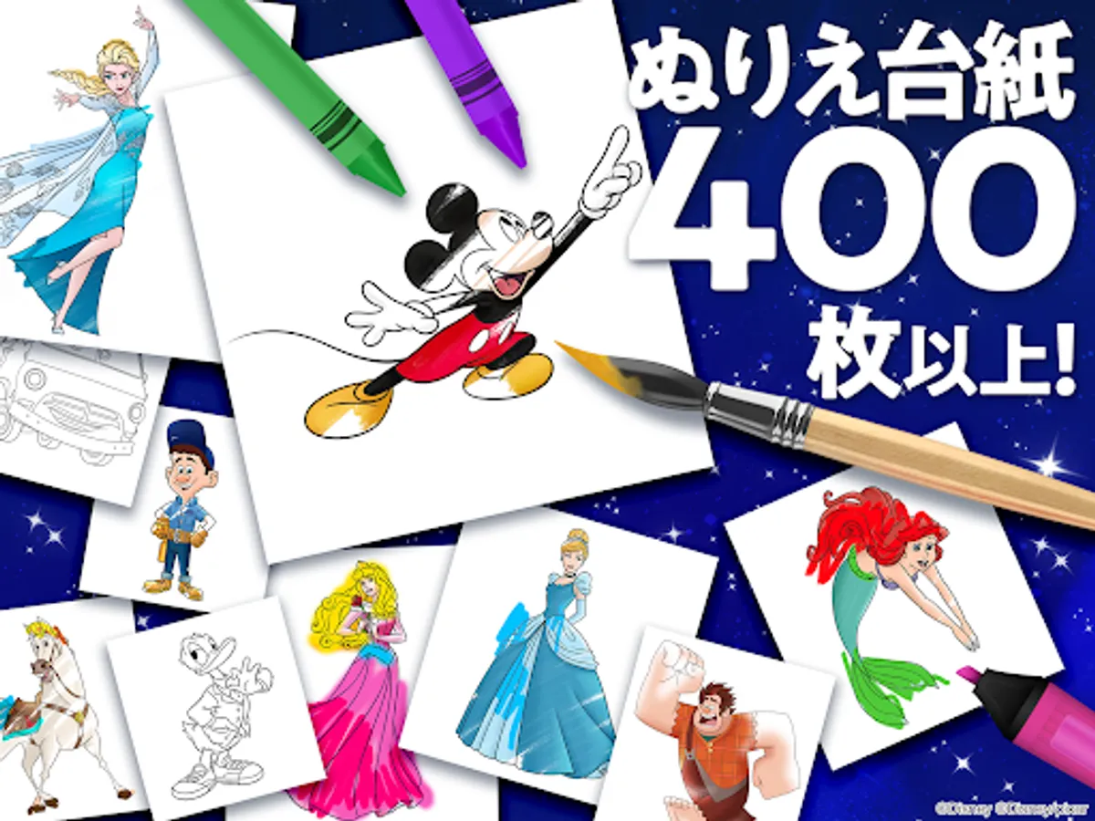 You can enjoy coloring with many tools such as crayons, markers, sprays, as well as glittering pens and pattern brushes that can be arranged into Mickey patterns. Let's make Rapunzel's hair sparkle, make Belle's dress from Beauty and the Beast a heart pattern, and make your favorite character your own!