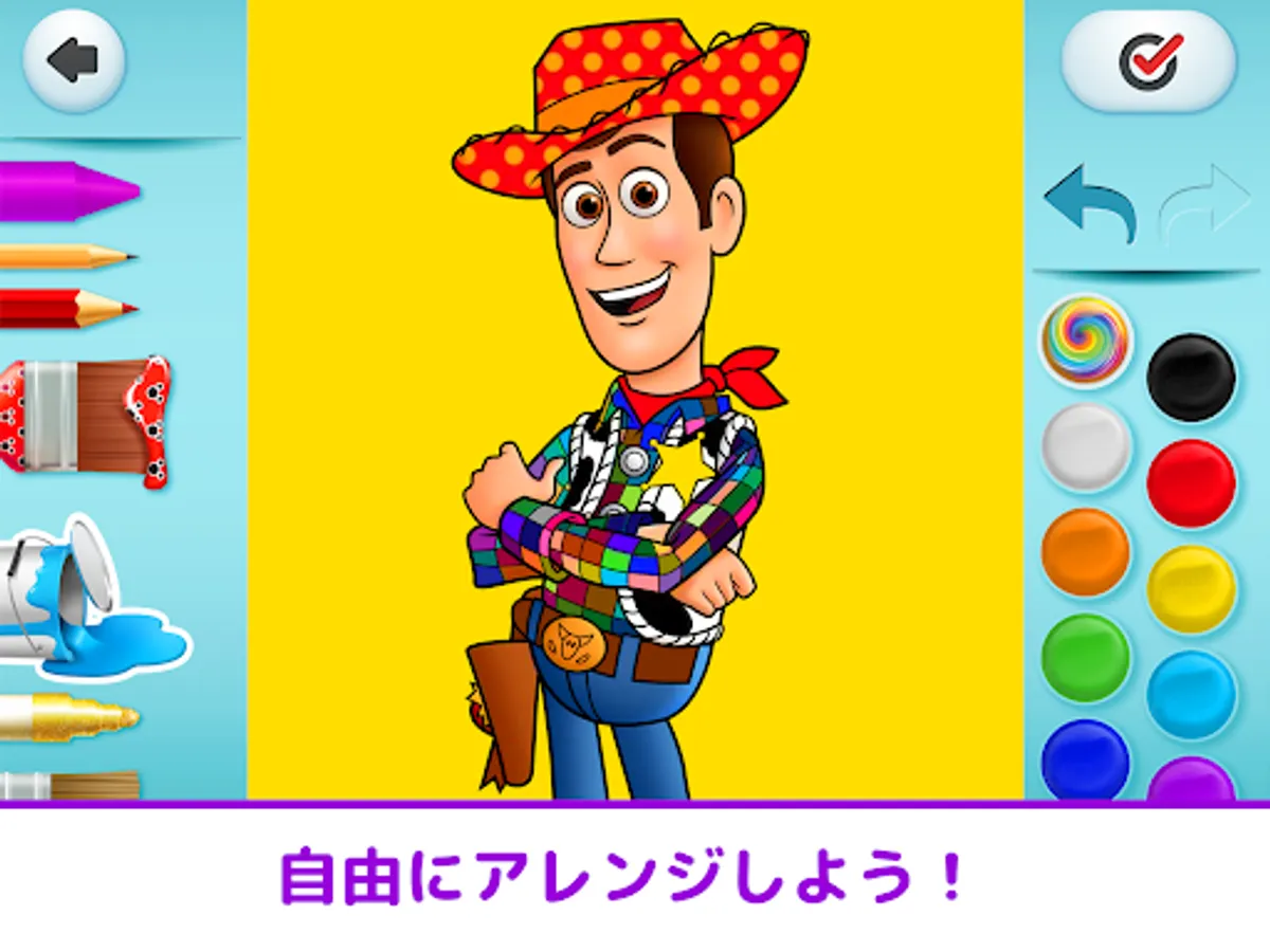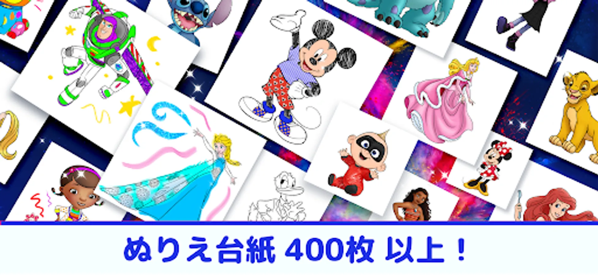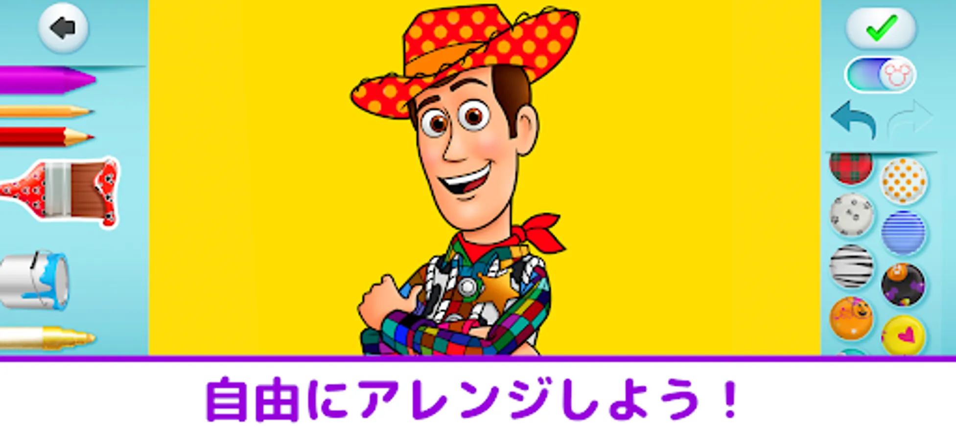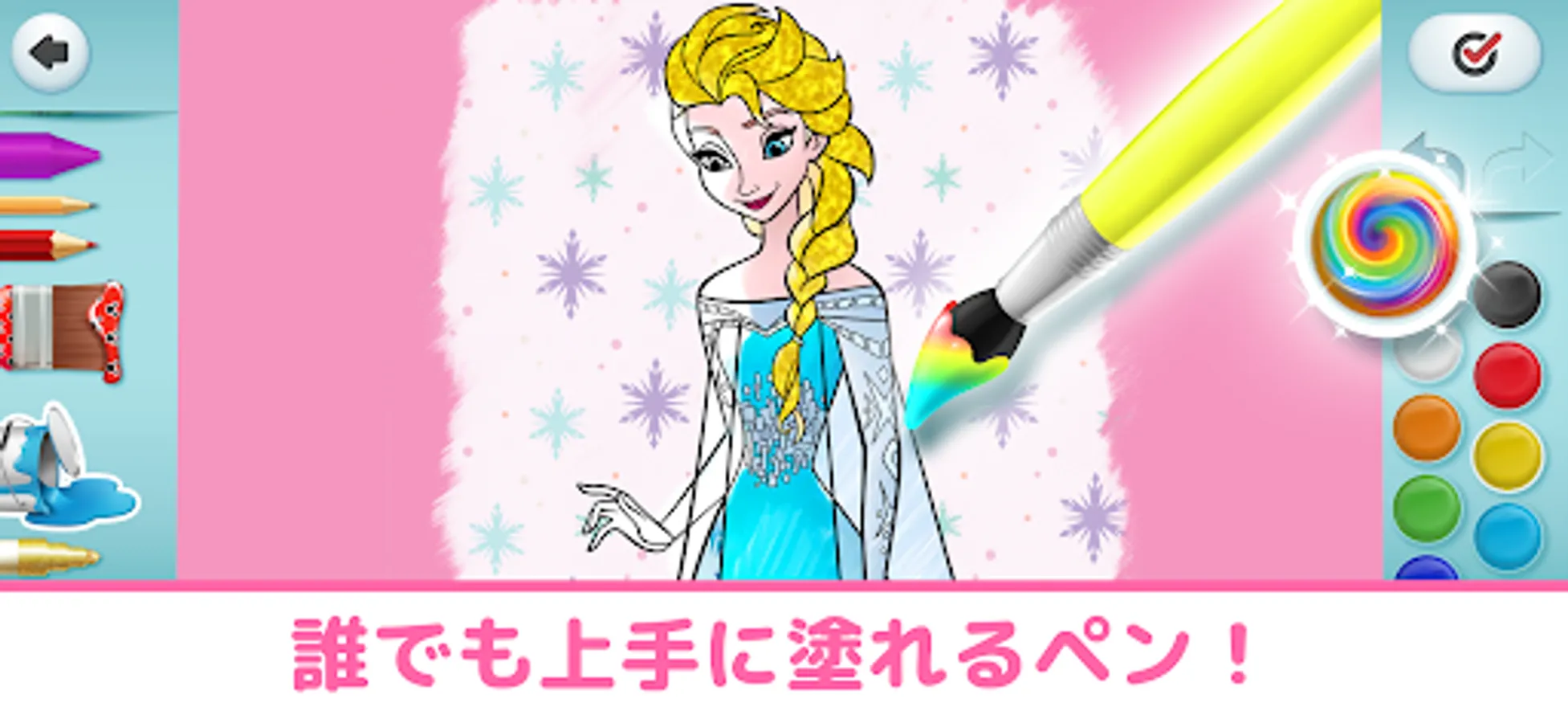 You can enjoy coloring with many tools such as crayons, markers, sprays, as well as glittering pens and pattern brushes that can be arranged into Mickey patterns. Let's make Rapunzel's hair sparkle, make Belle's dress from Beauty and the Beast a heart pattern, and make your favorite character your own!