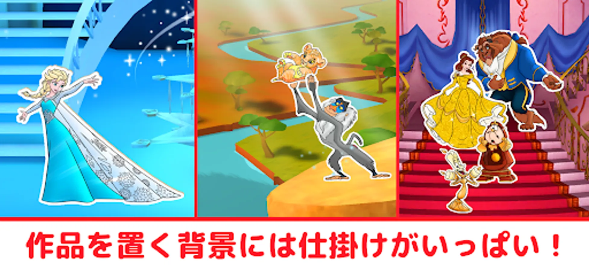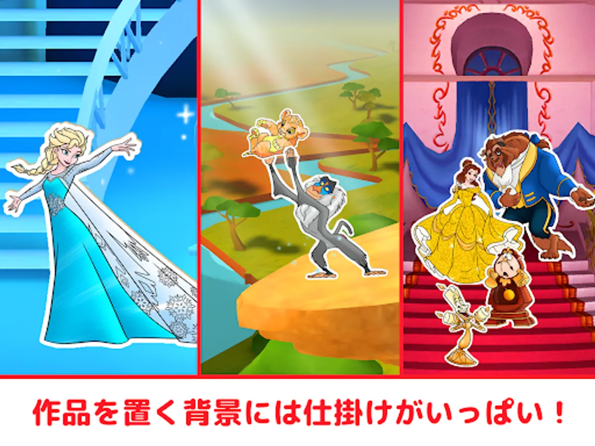 When you finish coloring the character, it turns into a plate and you can play with it by placing it on the 3D background set! The characters move in different ways depending on where they are placed. Disney's world view background sets such as Magic Kingdom, Elsa's ice palace in Frozen 2, Enchanted Forest in Frozen 2, and Rapunzel's tower have tricks here and there, and sounds when touched. and movement can be enjoyed.