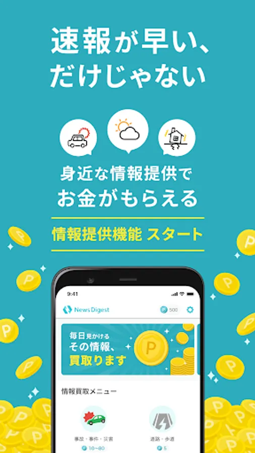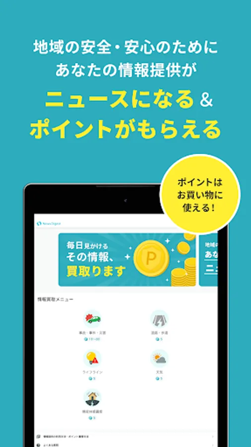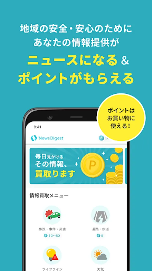NewsDigest from now on is not just information fast. By providing information that leads to the safety and security of the region, points will be given according to the content, and it will be news. Points can be exchanged for gift certificates, other company points, etc., and can be used for shopping.
