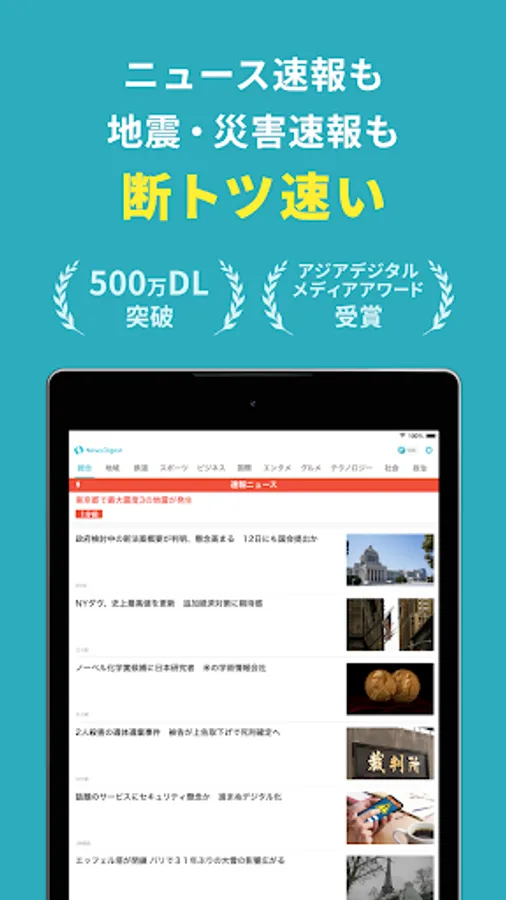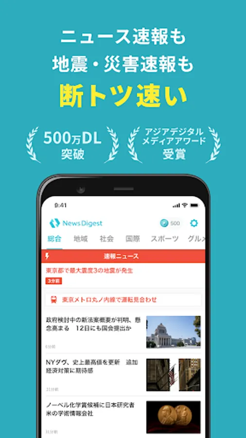 "NewsDigest", which covers breaking news, earthquake breaking news, and disaster breaking news, is the first news app in Japan to win the prestigious Asian Digital Media Award, so you can feel safe using it.