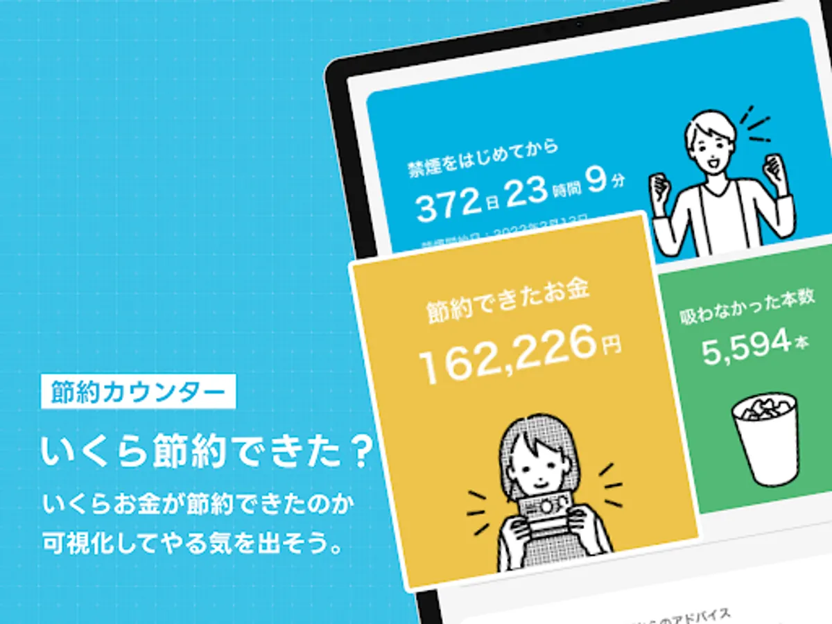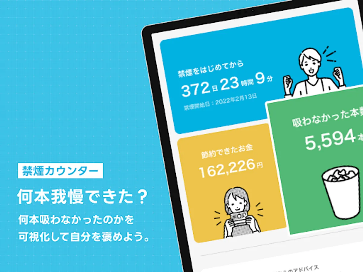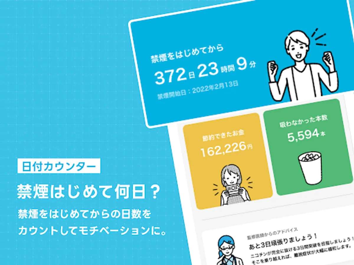 There are various functions specialized for smoking cessation to support your smoking cessation. For example, you can set a smoking cessation goal with the "cigarette counter" function that displays the number of cigarettes you did not smoke and the amount of money you saved, and the goal setting function. Also, for those who challenge smoke reduction, a smoke reduction mode is also available.