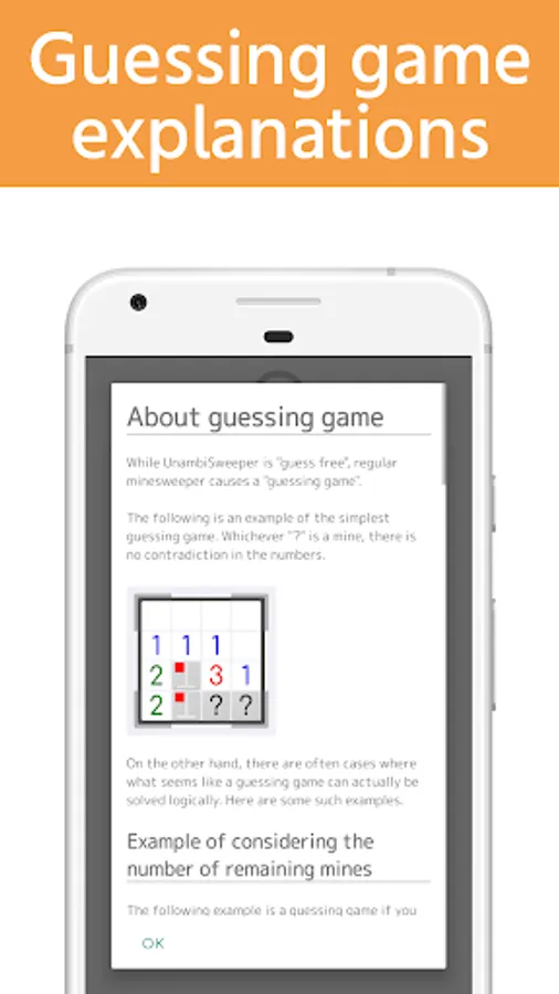 "UnambiSweeper" has overcome the "guess", the weakness of "Minesweeper" and is logically solvable until the end. (unambi = unambiguous)