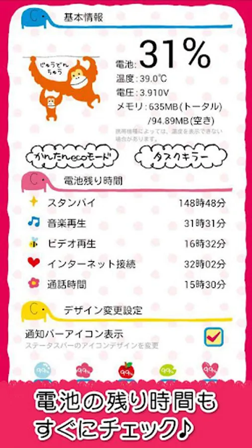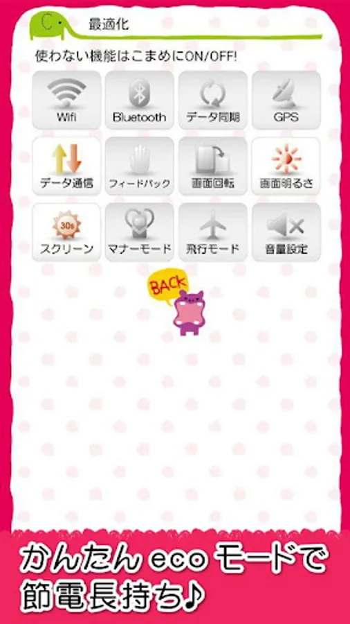 "The often consumption of smartphone of the battery to be worried about a little. I want more crisp comfortable to use ...." To solve such worries! Cute little silly animal we have, such as clearly the battery status can be power-saving long-lasting battery of smartphone navigate ♪ one-tap to crispy faster smartphone that became "easy eco mode" and dull "task killer" function, it loose Animal it will strongly support a comfortable Sumahoraifu of Atata ♪