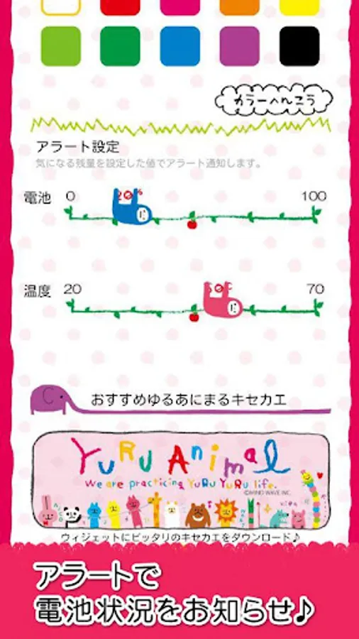 Since the animal to loose With the alert function that he has reached the battery level and temperature set is willing to inform alert to inform ★ advance in dialogue, "there, the battery is no longer!" Nante also prevent it !