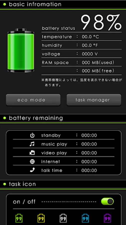 To resolve such a trouble ! Easy to understand and navigate the battery status in the battery tap ! ! This strong support to speed up the crisp smartphone which has become dull and "" simple eco mode "" that can be power-saving long-lasting battery of a smartphone such as one-tap "" task killer "" feature , a comfortable Sumahoraifu ! !