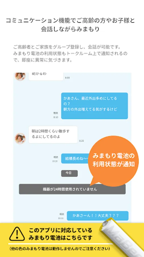 In the talk room (up to 6 people), you can group the elderly and family and have a conversation. At the same time, the usage status of the Mimamori battery will be notified in the talk room, so you will notice an abnormality.