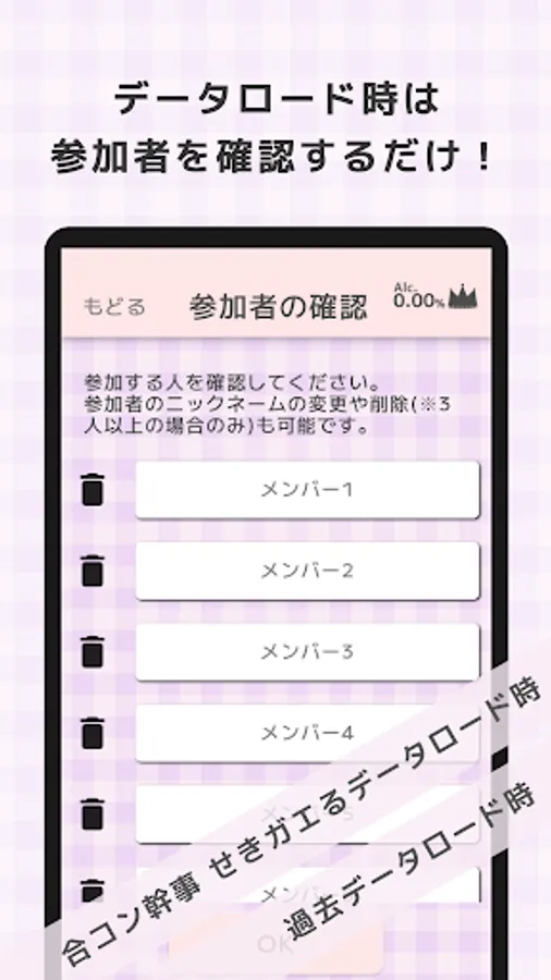 If you use the participant list of "Gokon Secretary Seki Gaeru", you can edit the participant name and delete the participant in "King Gemu (non-alcoholic version)". However, this content is not reflected in the data used in "Gokon Secretary Seki Gaeru". If you want to change the data used in "Gokon Secretary Seki Gaeru", please change it in "Gokon Secretary Seki Gaeru".