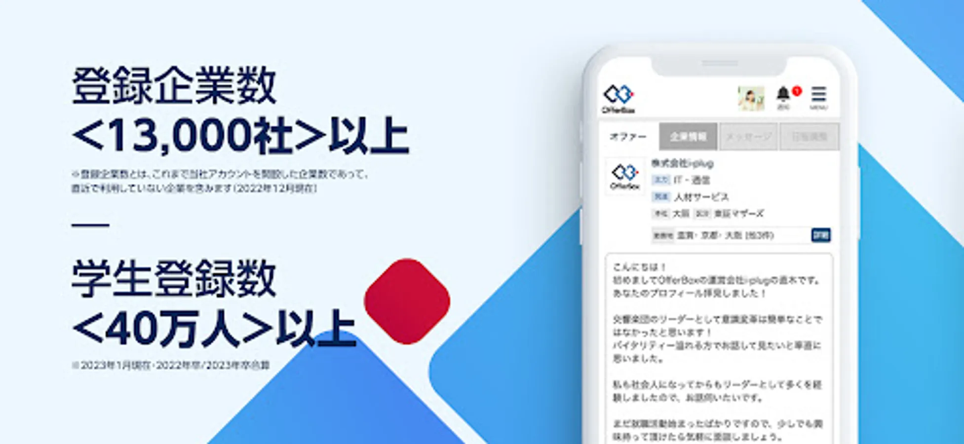 More than 420,000 people (*As of April 2023, 2023 graduates/2024 graduates combined), more than 14,000 companies, including companies listed on the First Section of the Tokyo Stock Exchange and major companies, are registered. The official free app for the service "OfferBox".