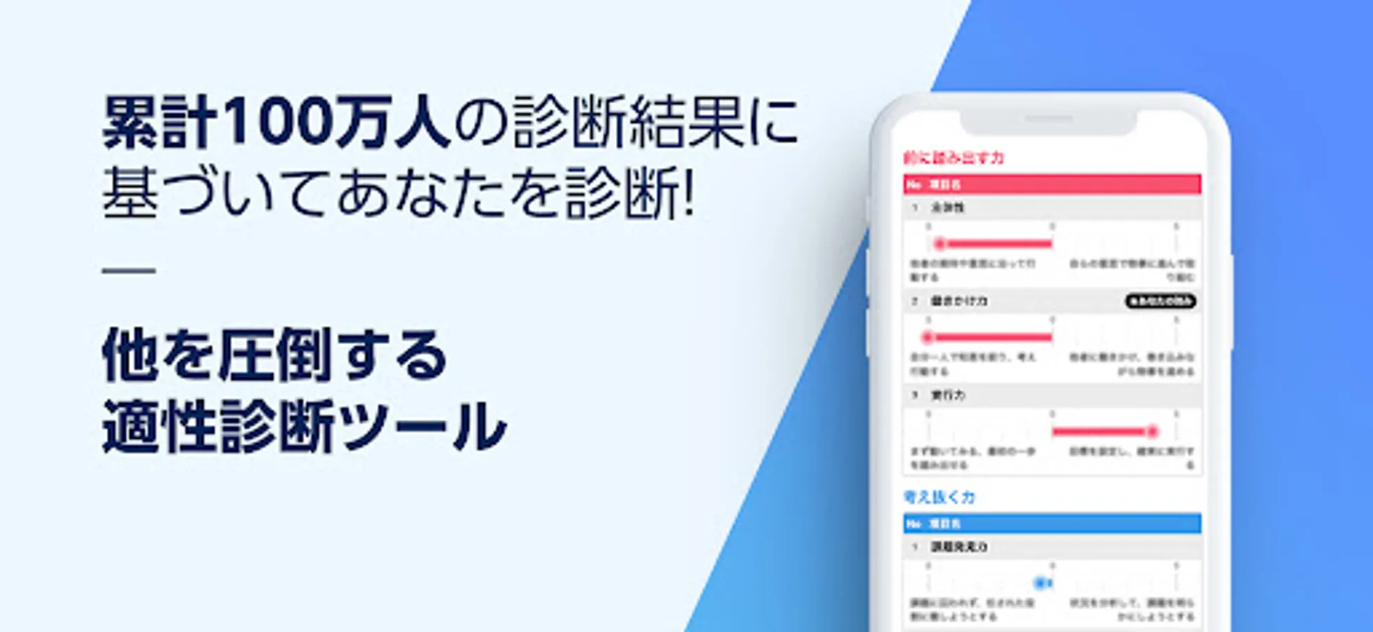 You can diagnose your basic ability as a member of society, strengths and weaknesses for free based on the cumulative diagnosis results of 1 million people. It will be helpful for self-analysis and interview preparation.