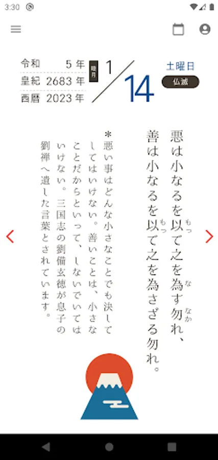 "Self-cultivation daily calendar" is a collection of sincere and practical teachings of Yellow Hat Professor Shuzaburo Kagiyama, Professor Shoin Yoshida who was active in Japan at the end of the Edo period, Sanai Hashimoto, Takamori Saigo, Sontoku Ninomiya, and the extremely poor clan. It is a daily calendar where you can learn the wonderful words of Yozan Uesugi, who rebuilt the finances, and many other predecessors who cared for the country and worked hard for Japan, as well as memorable waka and songs every day.
