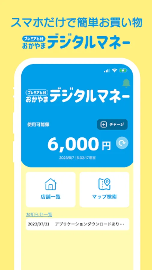 "Okayama Digital Money" is an application that allows you to charge digital money on your smartphone and use it at stores.