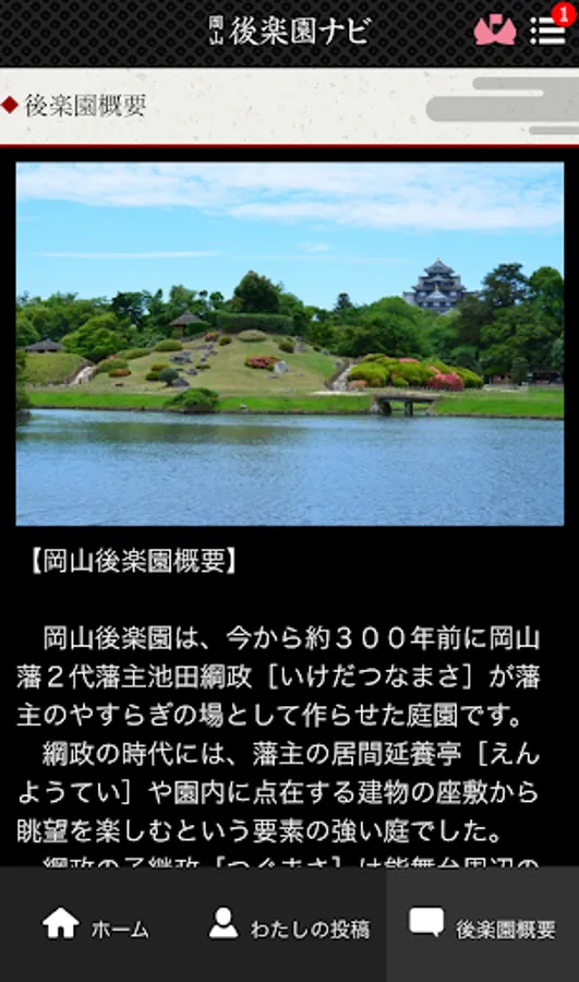 "Okayama Korakuen Navi" events and buildings of one within the "Okayama Korakuen" of Japan's three people Garden, and focus on the attractions one by one, such as a vegetable, is a useful application that can know deeply in the photos and videos. In addition, your "Okayama Korakuen" tourism more convenient, it is feature-packed to more fun to navigate.