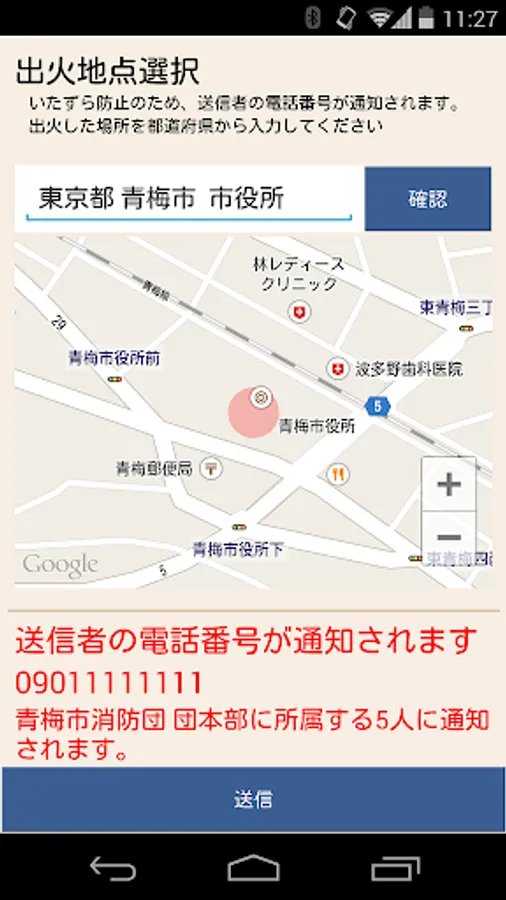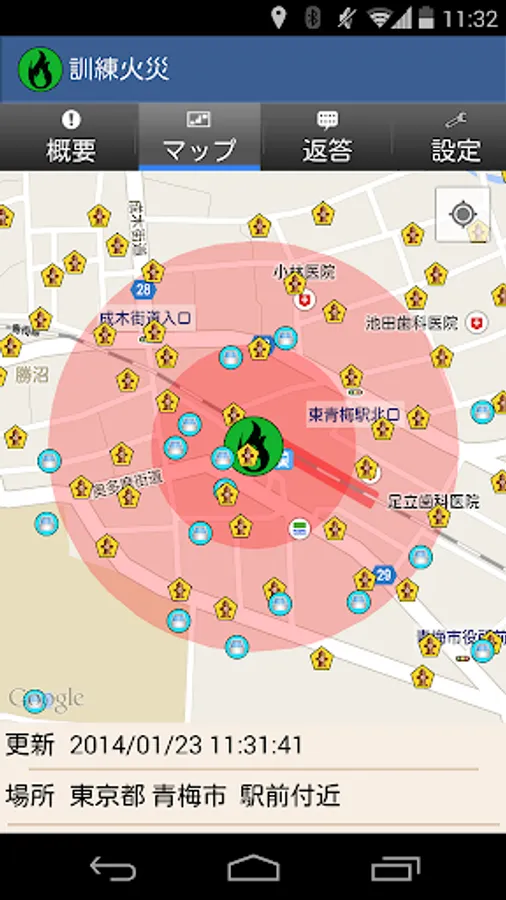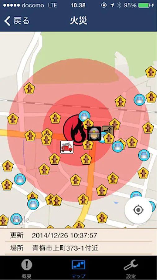 災害情報(火災、鎮火、誤報、迷い人)を判別し地図上に火点表示。