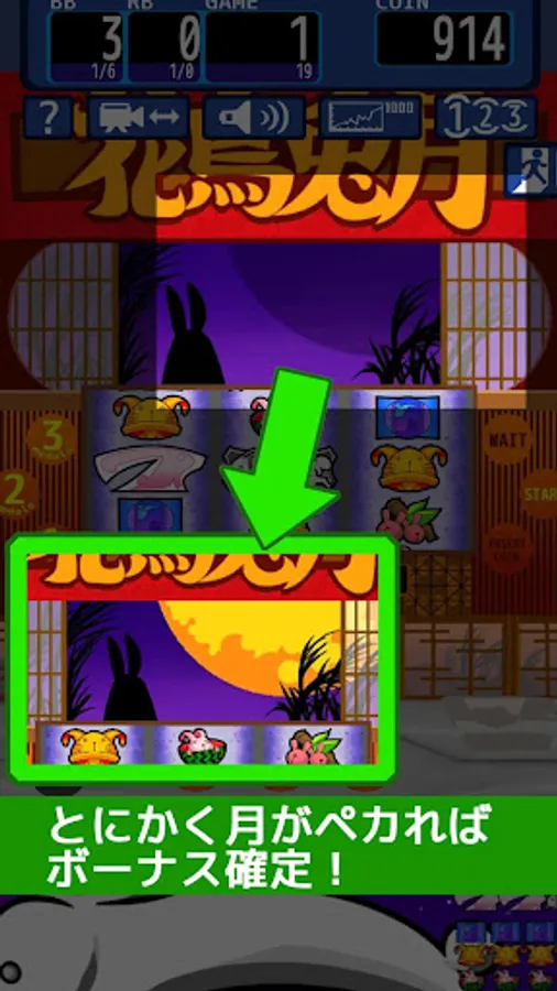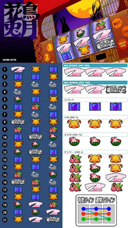 何のとは言えないが、5.5号機におおむね準拠した、Aタイプスロット。ボーナスはBIG300枚、REG100枚の2種類(ボーナスゲームは省略されている)。ボーナスは単独成立の他、すべての子役と重複する可能性がある。当選ゲームでの告知は60%、普段と違うプレミアム告知ならBIGが濃厚となる。リールアクションにも注目!純押し、挟み押しは、第三停止が滑れば激アツ。中押しは、中段にスイカが止まると大チャンス。逆押し、逆挟みは、ボーナスがテンパイすれば?!細かいことは気にするな!兎にも角にも満月が点灯したらボーナス濃厚!