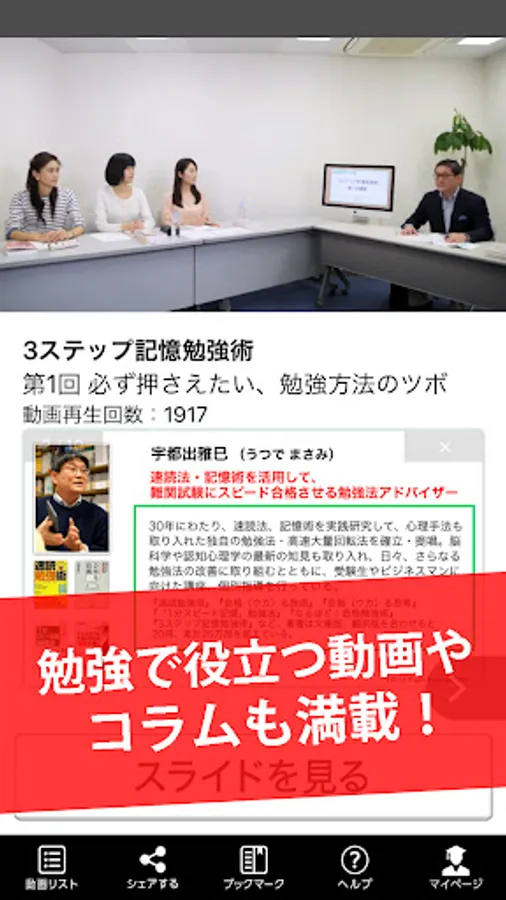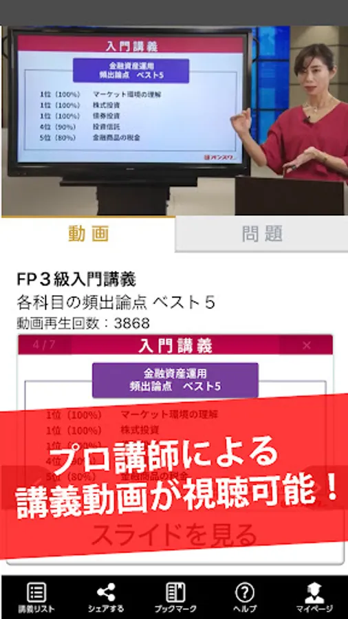 Since you can see the progress rate and correct answer rate for each theme, you can see at a glance your current strengths and weak areas. Furthermore, it is also possible to extract only "mistakes" or "bookmarked videos/questions" and try again.