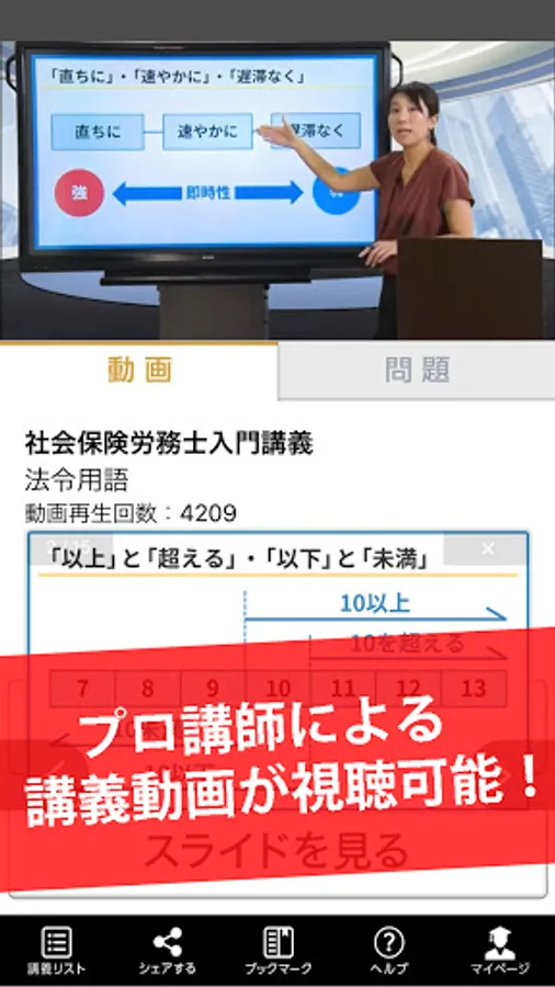 You can manage the content you are studying on "My Page". You can check the "progress rate" and "correct answer rate". Since you can see the progress rate and correct answer rate for each theme, you can see at a glance your current strengths and weak areas. Furthermore, it is also possible to extract only "mistakes" or "bookmarked videos/questions" and try again.