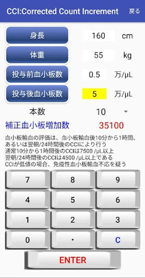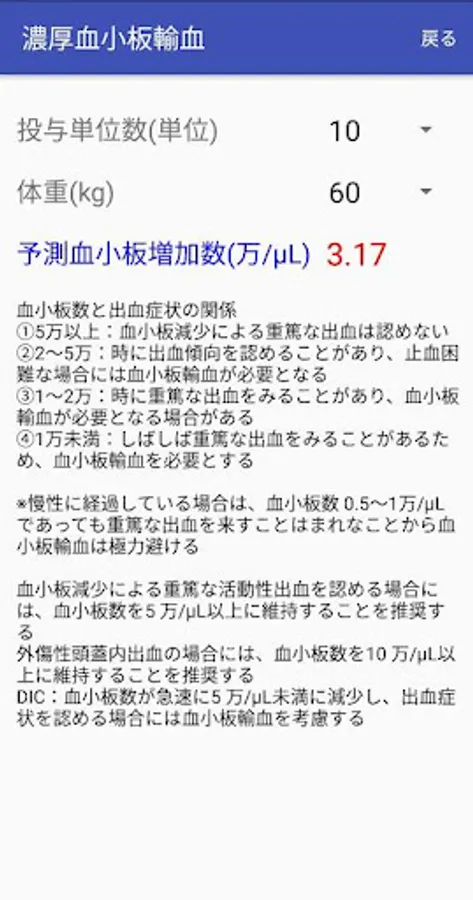 予測上昇Hb値、予測血小板増加数、予測上昇凝固因子活性値、アルブミン期待上昇濃度が計算できます。また、血小板輸血による効果の評価のためのCCI簡易計算ができます。