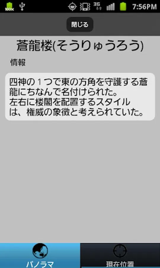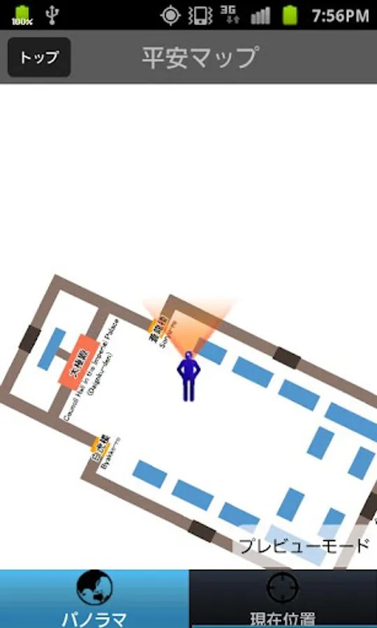 Holding the mobile device horizontally to the ground you can see a map view with the layout of the buildings from the past allowing you to easily understand the relationship to the current buildings.