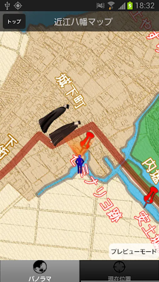 安土城をタップすると、3Dモデルで再現した安土城、高精細画像で再現した安土城など色々な表現の安土城をご覧いただけます。ポイントによって見ることのできる内容が異なりますので、色々なポイントを巡ってください。(中にはそのポイントでしか楽しめない機能もあります)