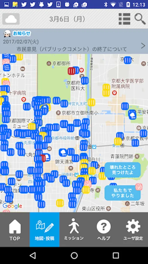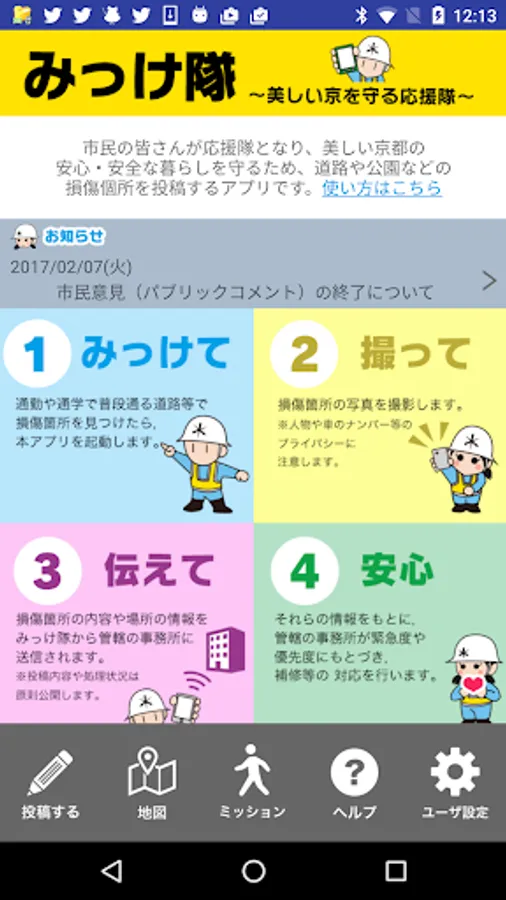 "京都市では、市民協働による公共土木施設の維持管理を進める取組として、道路、河川、公園の損傷箇所をスマートフォンから市に投稿できる「みっけ隊」アプリケーションを開発しました。