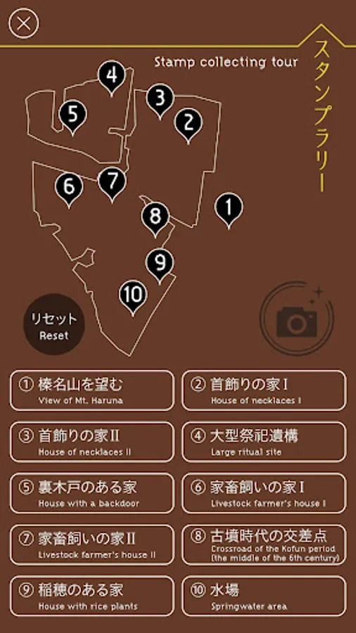黒井峯遺跡に設定された10ヵ所のビューポイントエリアに入ると古墳時代の集落を再現した360度VRが自動で表示されます。